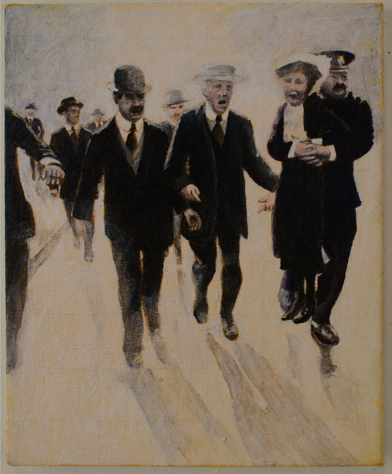The Arrest of Suffragette Leader, Emmeline Pankhurst, London 1914. acrylic on canvas, 9″ x 11″ 2015